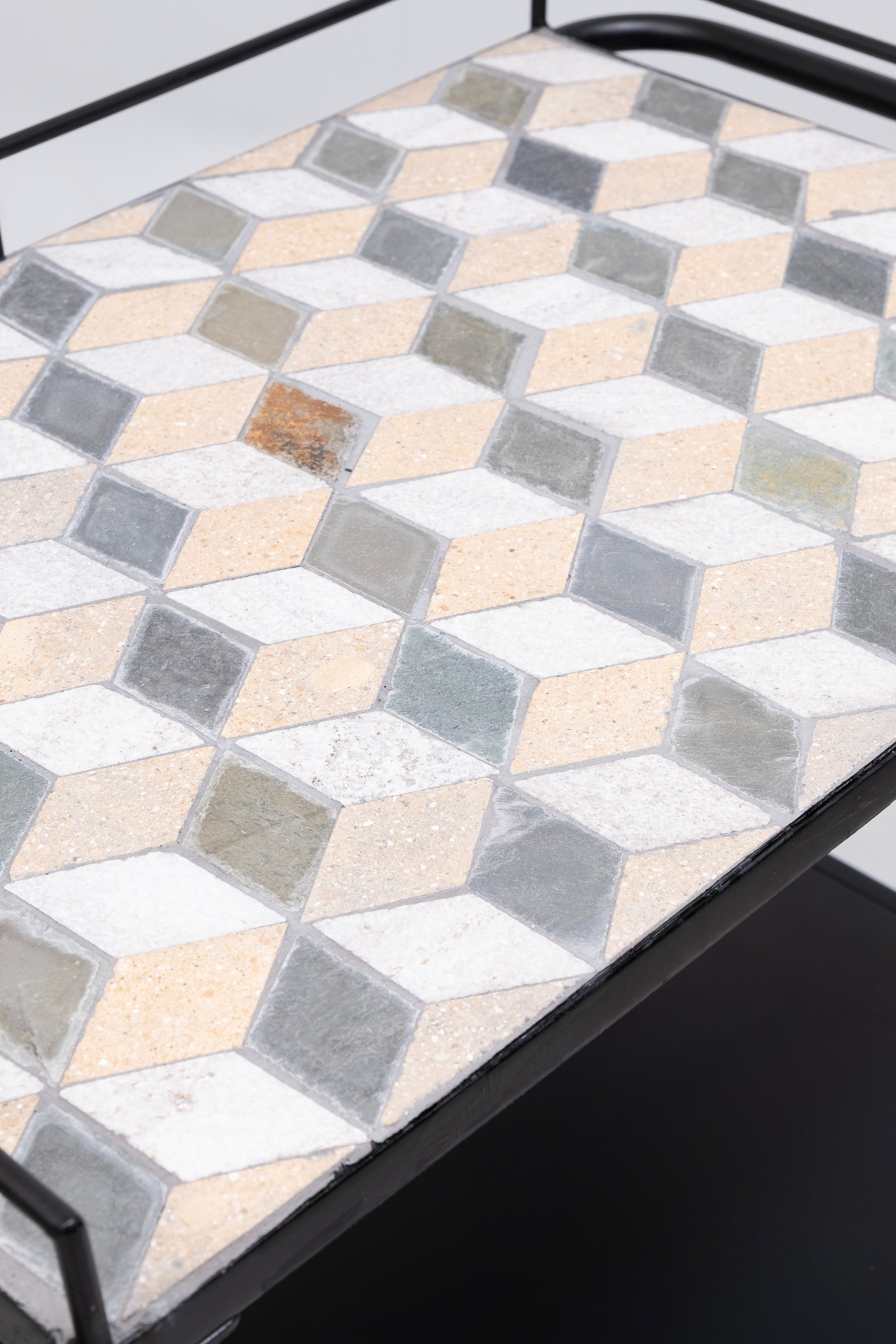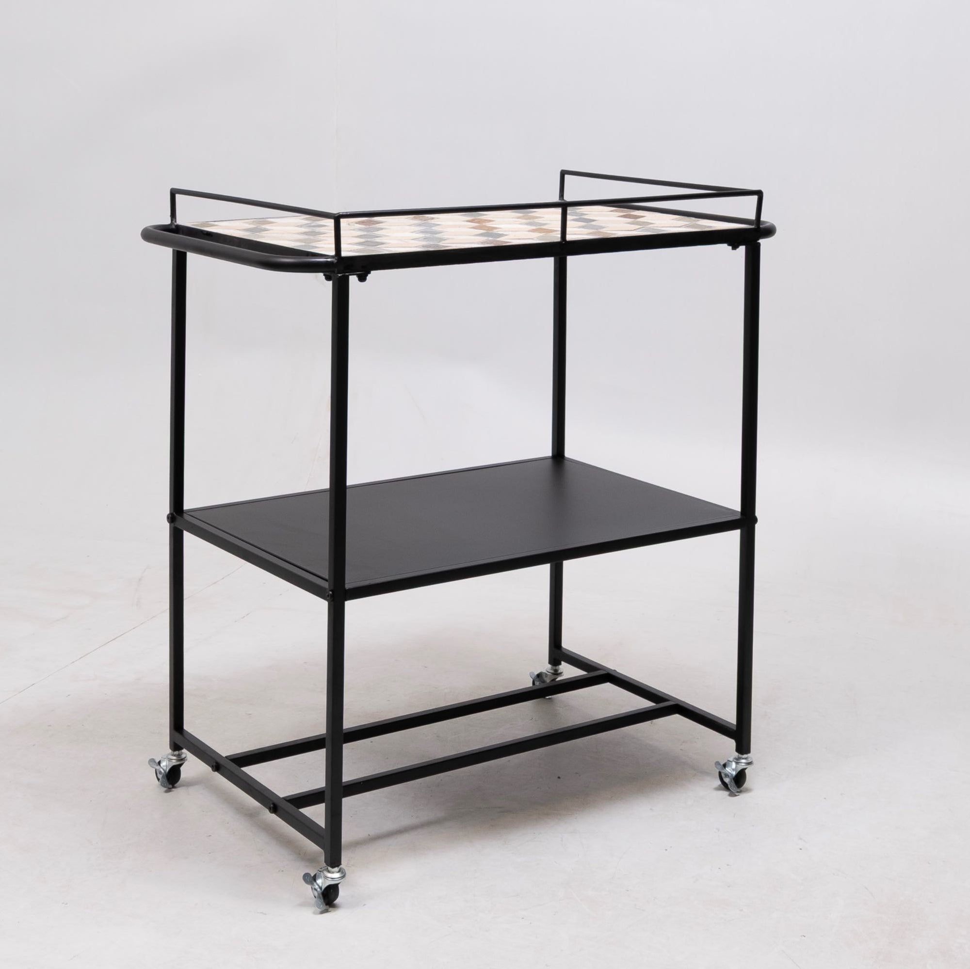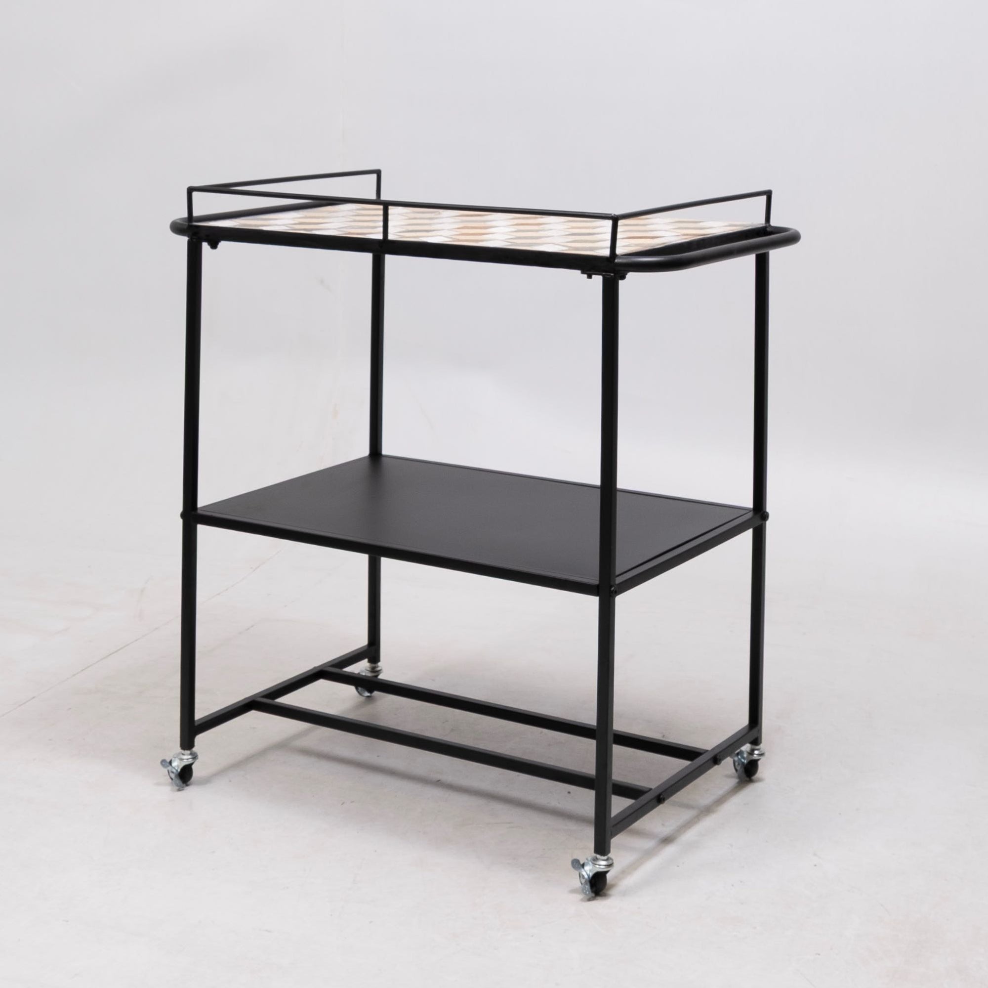 This serving trolley with wheels is very sturdy and features a chic retro design. It includes side handle bars on two sides and a railing on three sides to prevent objects from falling off. Also include is a metal shelf below and castors. The patterned stone insert not only adds unique style but is also very easy to clean.